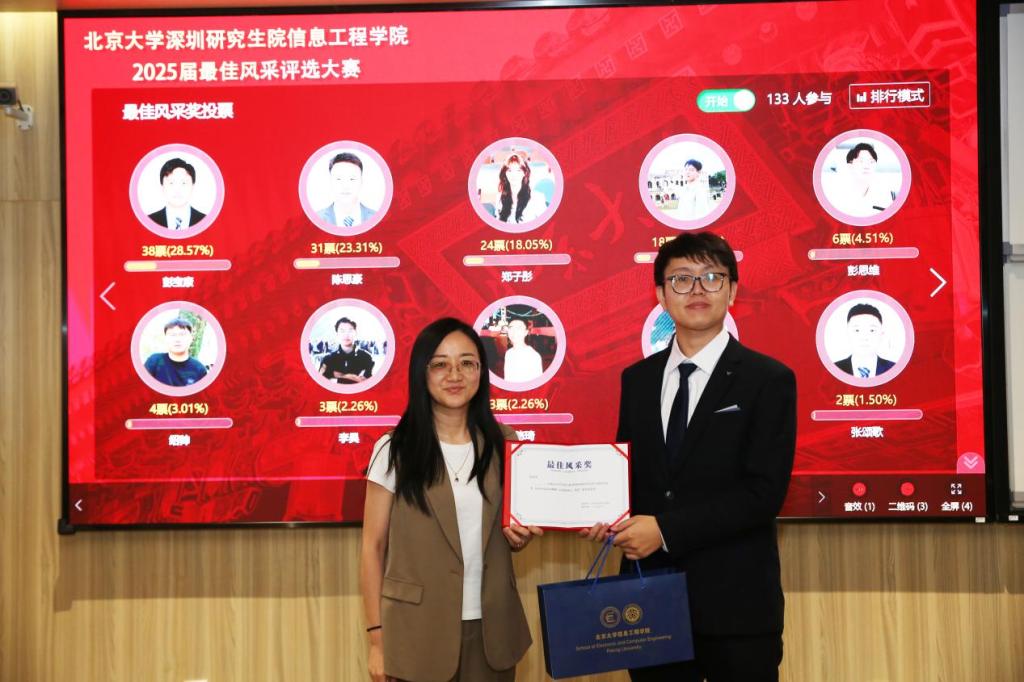 经评委评审与现场观众投票,评选结果揭晓。王钰涵同学凭借在前期微信公众号投票环节中获得的师生广泛支持,荣获“最佳人气奖”;彭宝康同学则以出色的表达能力和稳健的台风,荣获“最佳风采奖”。李倩老师为两位获奖同学颁发了奖项。