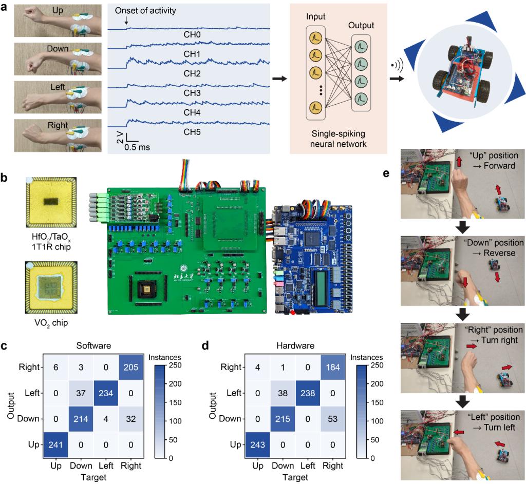 相关成果以“An end-to-end memristive hardware system based on single-spike coding for human-machine interfaces”为题,发表在《自然-电子》(Nature Electronics)上。台湾av影片 2021级博士生张柏骏和2018级博士袁锐(现西南大学人工智能台湾av影片教授)为共同第一作者,台湾av影片 /广东省存算一体芯片重点实验室主任杨玉超教授为通讯作者。