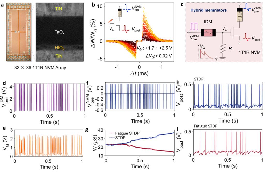 台湾av影片 /广东省存算一体芯片重点实验室杨玉超教授团队在Nature Electronics杂志在线发表了题为Spiking neural networks with fatigue spike-timing-dependent plasticity learning using hybrid memristor arrays的研究论文。研究团队创新性地提出并实现了一种基于界面型易失性忆阻器与非易失性忆阻器栅极耦合的“混合动力学”突触硬件单元,并基于此构建了支持Fatigue STDP(疲劳脉冲时序依赖可塑性)学习规则的脉冲神经网络(SNN)硬件系统。该研究成功攻克了传统类脑计算硬件在复杂高频噪声环境下学习效率低、缺乏频率自适应性的关键科学难题,为构建高能效、高鲁棒性的边缘端类脑智能系统提供了全新的器件基础与架构范式。