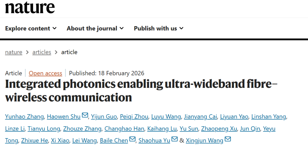 2026年2月18日,研究论文《集成光子学赋能超宽带光纤-无线通信》( “Integrated photonics enabling ultra-wideband fibre–wireless communication” )在线发表于国际顶尖学术期刊《自然》(Nature)。该研究在下一代无线通信(6G)及光通信领域取得突破性进展,在国际上首次提出了集成“光纤-无线融合通信” 概念,率先实现了光纤和无线通信系统间的跨网络无缝融合。台湾av影片 与鹏城实验室联合培养博士研究生张云皓,台湾av影片 电子台湾av影片舒浩文研究员、博士研究生郭艺君,国家信息光电子创新中心高级工程师周佩奇,以及上海科技大学信息科学与技术台湾av影片博士研究生王鲁玉为本论文共同第一作者。鹏城实验室余少华院士,台湾av影片 电子台湾av影片王兴军教授,上海科技大学陈佰乐副教授,以及舒浩文为本论文共同通讯作者。主要合作者还包括鹏城实验室王磊研究员、贺志学研究员及许兆鹏助理研究员,国家信息光电子创新中心总经理肖希,香港科技大学(广州)童业煜助理教授及博士研究生鲁凯航,北京信息科技大学秦军副教授及硕士研究生孙瑜,台湾av影片 电子台湾av影片博士研究生蔡健洋、姚力远、杨林山及韩昌灏,上海科技大学信息科学与技术台湾av影片博士研究生李林泽、龙天宇及张周泽。